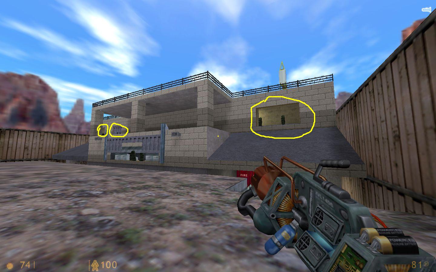 789,789... Блин, наизусть не помню, у меня там куча мултисорсов. Резкая граница - да это всё Nitro жаловался, что по забору-границе карты можно ходить, вот в попытках это исправить забор и стал таким тонким. Хз, надо чего нибудь придумать. Фиговина с окном -да, я думал, как бы ее перекрасить. Пока не придумал. Сверху стрелки-это не я, это декаль такая. Кнопка активируется сквозь стену? Ого  Может быть, оставить? Будет в стиле 6000 6v6,кнопки которая "ляляля" =) Вход такой: становиться на двойную лампу в комнате с валяющейся лестницей.