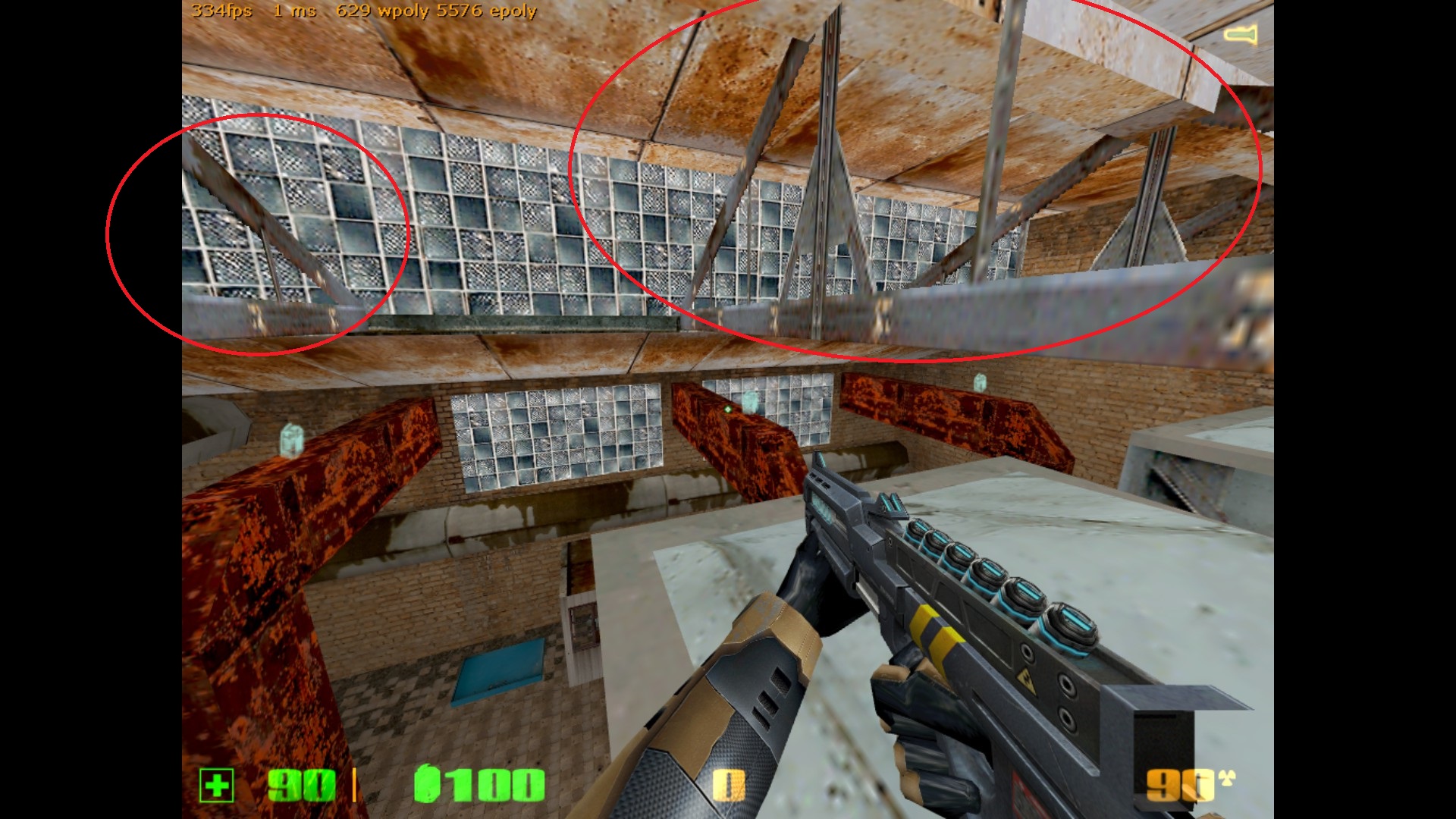 4) Супер! 5) Заметил арбалет на земле - хорошее решение. 6) Новый цвет трубы смотрится лучше. Теперь мои соображения: 1) В центральном здании не хватает пары-тройки обычных аптечек. Это единственная зона на карте, где никак нельзя пополнить здоровье. Зарядник вешать туда не стоит - их уже на карте много, но кинуть парочку-троечку аптечек, на мой взгляд, стоит. Можно их положить как-нибудь помудрёней, чтоб попрыгать ножками/гауссом/лонгджампом. 2) В центральном здании три батарейки под потолком достаточно геморрно взять из-за балок между трубами, на которых эти батарейки стоят. Если такое усложнение задумано, чтоб путь их подбора был не гладкий, то ок, но я бы их, например, переместил в другое место (см. скриншоты). Вложение: