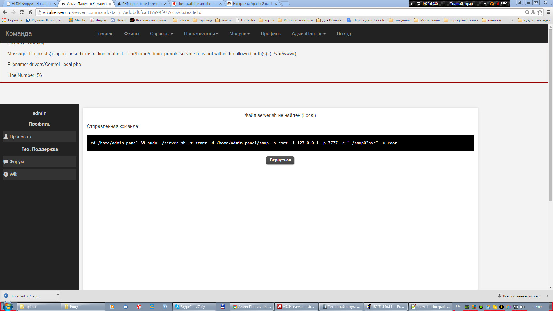 Dr.Cheater писал(а): Эта ошибка никак с панелью не связана. Смотрите php_open_basedir: добавьте туда /home/admin_panel/ (будет так: ".:/var/www/:/home/admin_panel/"). Подскажите в какой файл это прописать нужно. .:/var/www/:/home/admin_panel/