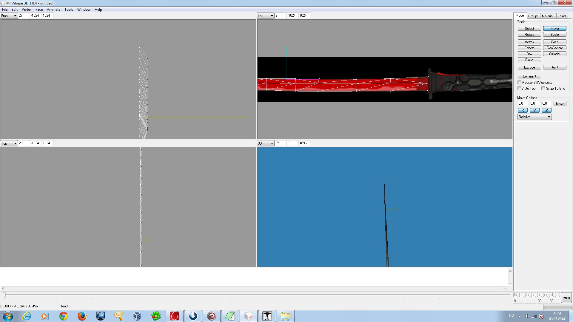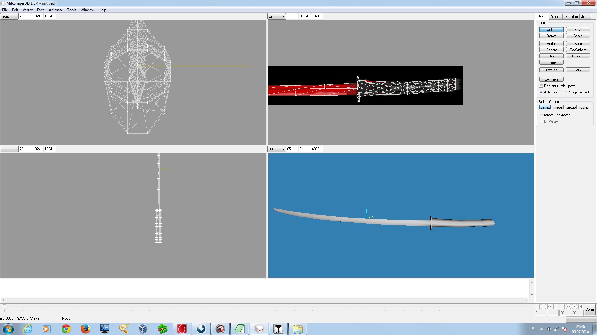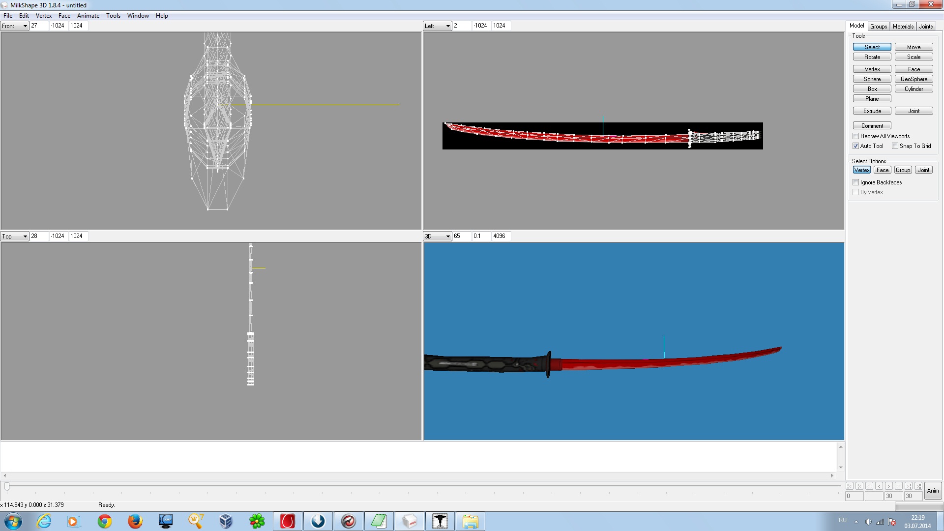 2.Во вкладке инструменов Model выбираем Vertex и ставим вертексы по краю лезвия клинка и по середине тоже поставим пару вертексов, чтобы лезвие не было плоским, ручку сделаем просто с помощью инструмента Cylinder.Вложение: