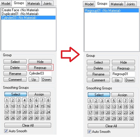 7.Объединяем все группы. В пенели инструменов во вкладке "Groups" выбираем все наши меши двойным нажатием на каждую и жмём кнопку "Regroup".Вложение: