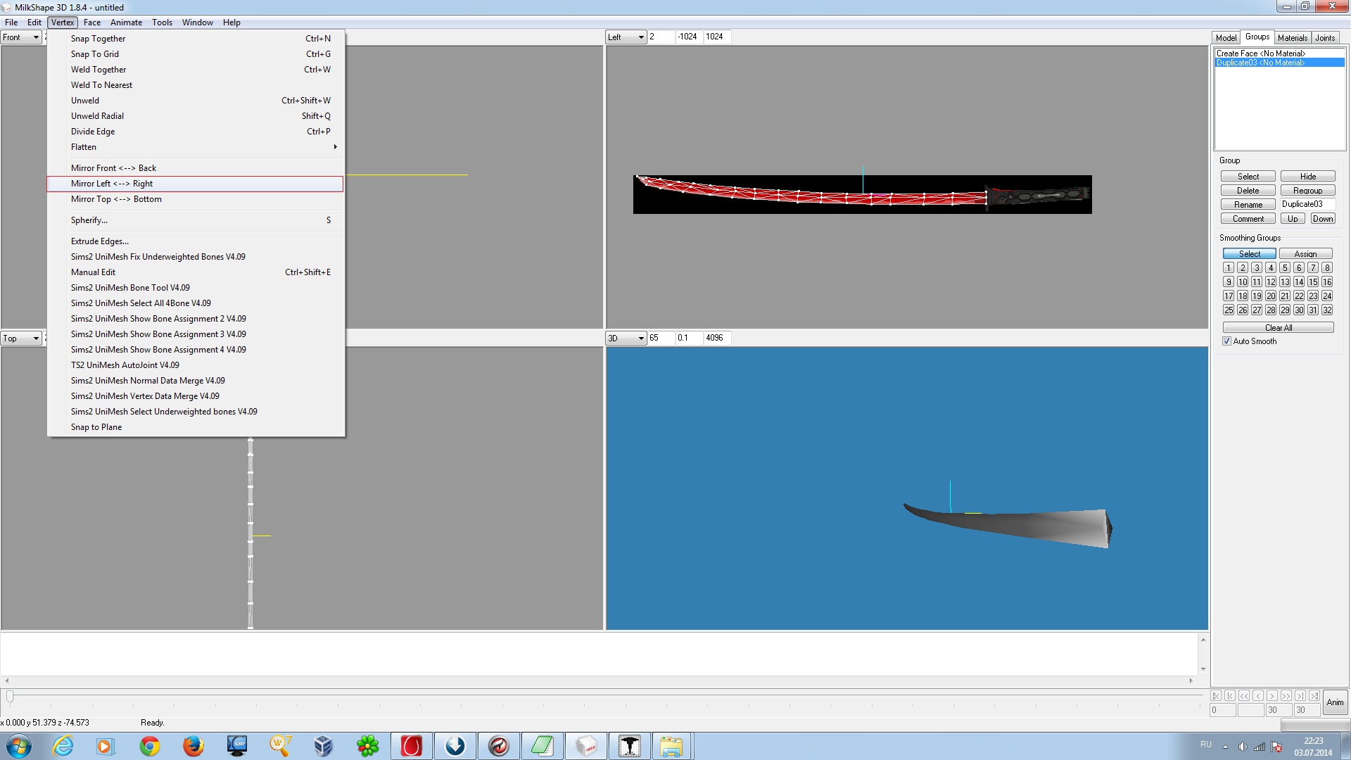 5.Создаём дубликат наших вертексов(фейсов,меши или хз как назвать) чтобы сделать вторую половину: Выбираем во вкладке "Groups" нашу группу вертексов, в данном случае "Create Face" и жмём Ctrl+D затем во вкладке Vertex выбираем Mirror Left<-->Right(если не правильно отразится, то попробуйте другие отражения).Вложение: