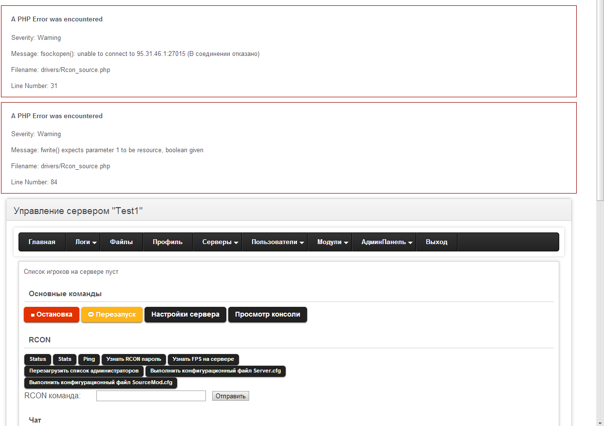 1. Warning: fsockopen(): unable to connect to 95.31.46.1:27015 (В соединении отказано) in /opt/lampp/htdocs/1/test.php on line 2