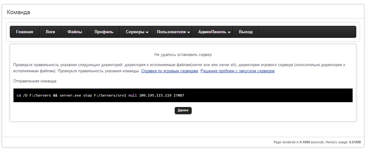 server.exe находится в папке F:/Servers ? Попробуйте вручную выполнить эту команду из командной строки: Код: cd /D F:/Servers && server.exe stop F:/Servers/srv1 null 0.0.0.0 27087