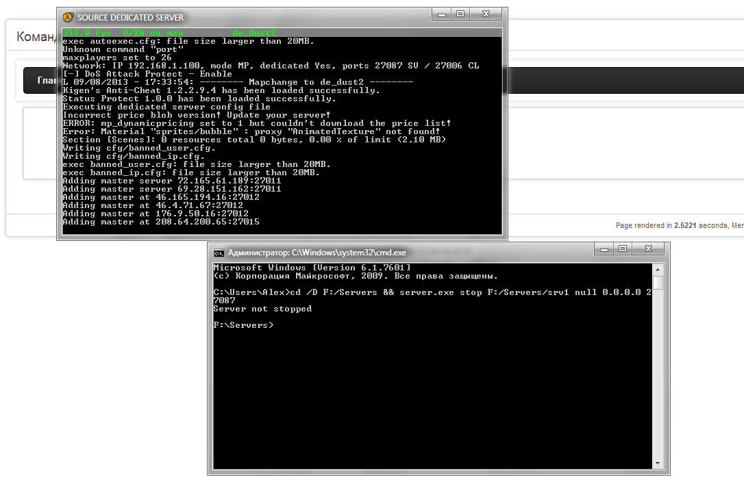 Попробуйте выполнить в консоли команду, которая указана в панели и напишите результат. server.exe = F:\Servers psexec.exe = F:\Servers, C:\Windows srcds.exe = F:\Servers\srv1 Protocol version 7 Exe version 1.0.0.34 (cstrike) Exe build: 14:38:01 Jun 25 2007 (3152) Вроде бы все.