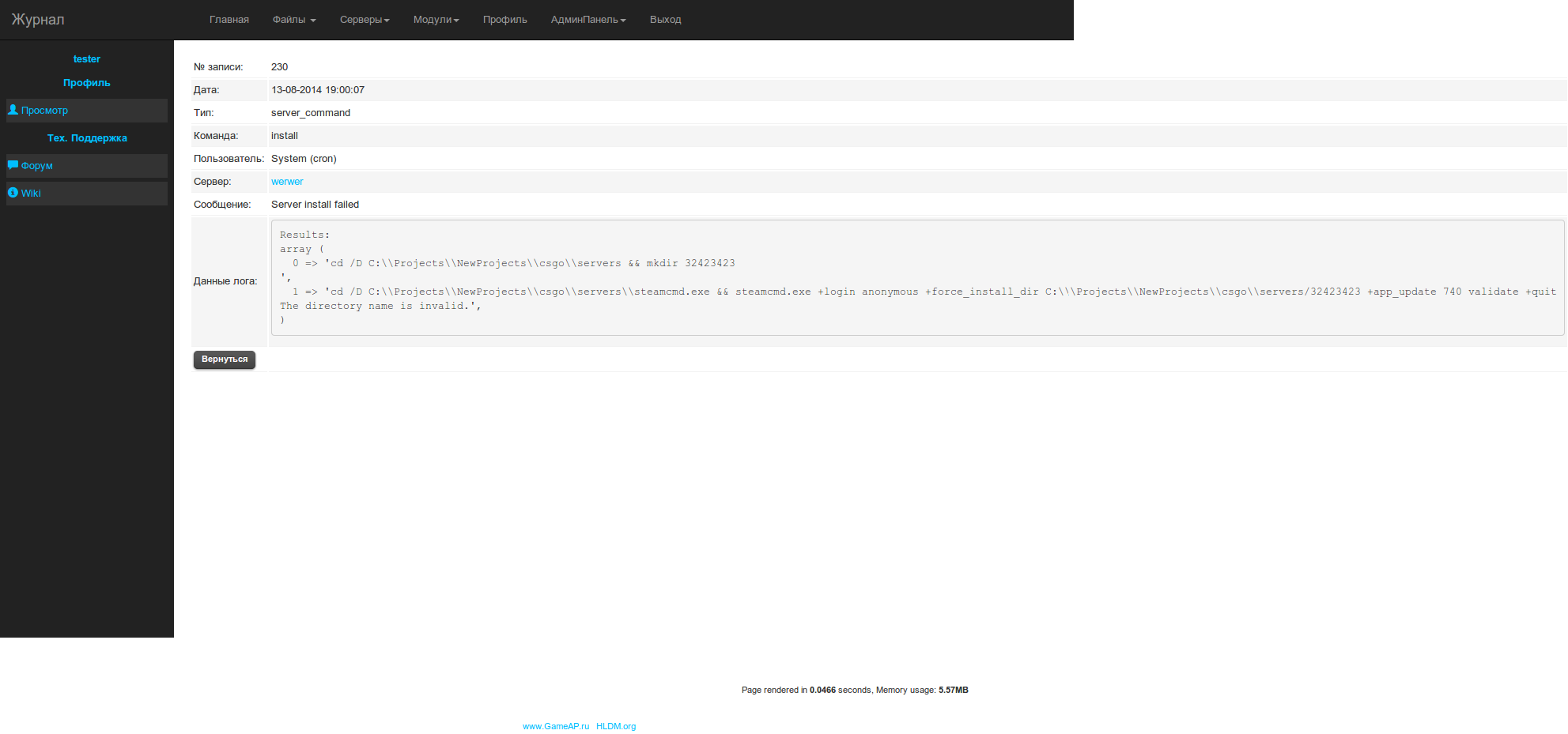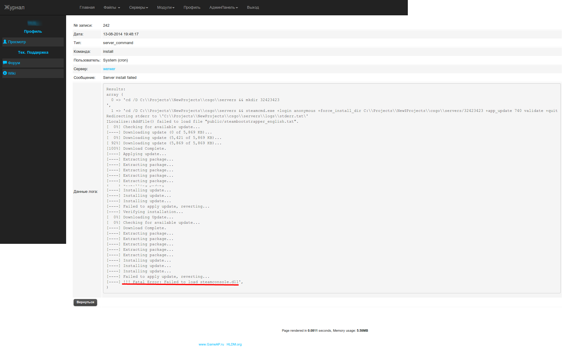 При попытке установить после установки прав админа, крон выдал это: == Task manager == Success: 0 Failed: 0 Skipped: 0 == Runner == Server #14 not installed Install from SteamCMD Install server failure Server install #14 failed == DS Stats == A PHP Error was encountered