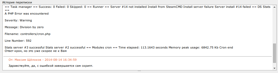 Невооруженным взглядом видно, что ошибки никакой нет, а лишь предупреждение (Division by zero), оно возникло из-за того, что при получении статистики был получен 0, где его не должно быть. Как известно, на нуль делить нельзя, скрипт попросту выдал предупреждение и стал дальше выполняться. Тех. поддержка же просто отмазалась, сказав, что ошибка в скрипте.