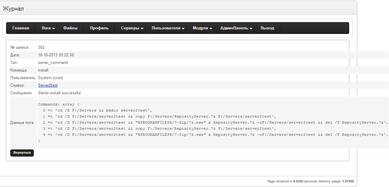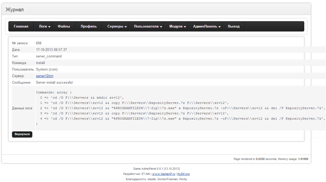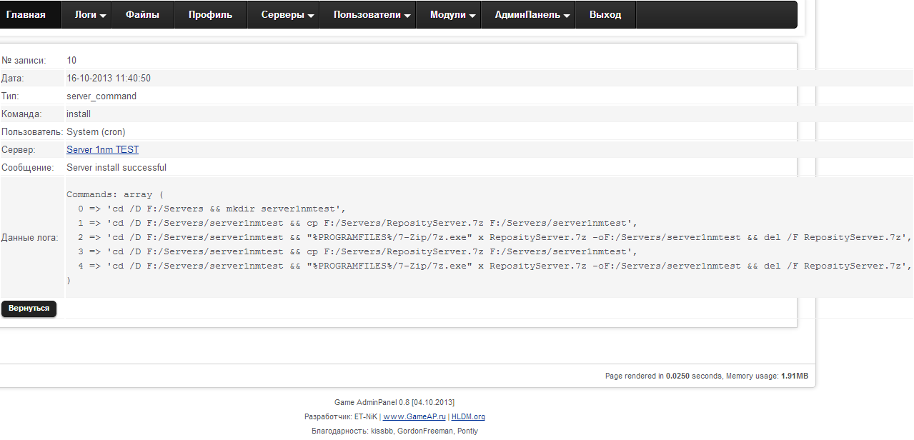 Баг панели, связанный с установкой игровых серверов через локальный репозиторий на Windows сервере. Обновите файл application/modules/cron/controllers/cron.phphttps://raw.github.com/ET-NiK/GameAP/a2 ... s/cron.php