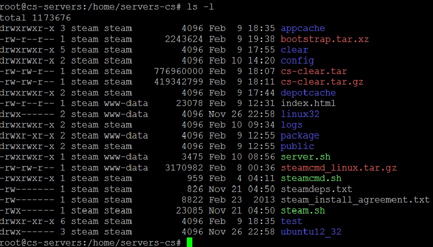 Вот на файлы !!! Код: root@cs-servers:/home/servers-cs/test# ls -l total 34080 drwxrwxr-x 4 steam www-data 4096 Feb 9 17:55 142342c584863bf6a2a7e971959dd9ba55b44bbd drwxrwxr-x 4 steam www-data 4096 Feb 9 17:36 b52952203fcc474e707f9c37f1a197a1925c779a -rwxrwxr-x 1 steam www-data 954176 Feb 9 17:55 core.so -rwxrwxr-x 1 steam www-data 658817 Feb 9 17:55 crashhandler.so drwxrwxr-x 14 steam www-data 4096 Feb 9 17:55 cstrike -rw-rw-r-- 1 steam www-data 45 Feb 9 18:54 debug.cmds -rw-rw-r-- 1 steam www-data 441 Feb 9 18:54 debug.log -rwxrwxr-x 1 steam www-data 303632 Feb 9 17:55 demoplayer.so -rwxrwxr-x 1 steam www-data 2948535 Feb 9 17:55 engine_i486.so -rwxrwxr-x 1 steam www-data 393734 Feb 9 17:55 filesystem_stdio.so -rwxrwxr-x 1 steam www-data 107270 Feb 9 17:55 hlds_linux -rwxrwxr-x 1 steam www-data 7778 Feb 9 17:55 hlds_run -rwxrwxr-x 1 steam www-data 171230 Feb 9 17:55 hltv -rwxrwxr-x 1 steam www-data 322152 Feb 9 17:55 libgcc_s.so.1 -rwxrwxr-x 1 steam www-data 17 Feb 9 17:55 libSDL2.so -rwxrwxr-x 1 steam www-data 3769939 Feb 9 17:55 libstdc++.so.6 -rwxrwxr-x 1 steam www-data 76032 Feb 9 17:55 libsteam_api.so -rwxrwxr-x 1 steam www-data 4383138 Feb 9 17:55 libsteam.so -rwxrwxr-x 1 steam www-data 474261 Feb 9 17:55 libtier0.so -rwxrwxr-x 1 steam www-data 441049 Feb 9 17:55 libvstdlib.so -rwxrwxr-x 1 steam www-data 948577 Feb 9 17:55 proxy.so -rw-rw-r-- 1 steam www-data 3 Feb 10 14:19 steam_appid.txt -rwxrwxr-x 1 steam www-data 16130904 Feb 9 17:55 steamclient.so drwxrwxr-x 16 steam www-data 4096 Feb 9 18:05 valve -rwxrwxr-x 1 steam www-data 900425 Feb 9 17:55 vgui2.so -rwxrwxr-x 1 steam www-data 975888 Feb 9 17:55 vgui.so -rwxrwxr-x 1 steam www-data 54955 Feb 9 17:55 voice_miles.so -rwxrwxr-x 1 steam www-data 664256 Feb 9 17:55 voice_silk.so -rwxrwxr-x 1 steam www-data 135312 Feb 9 17:55 voice_speex.so root@cs-servers:/home/servers-cs/test#