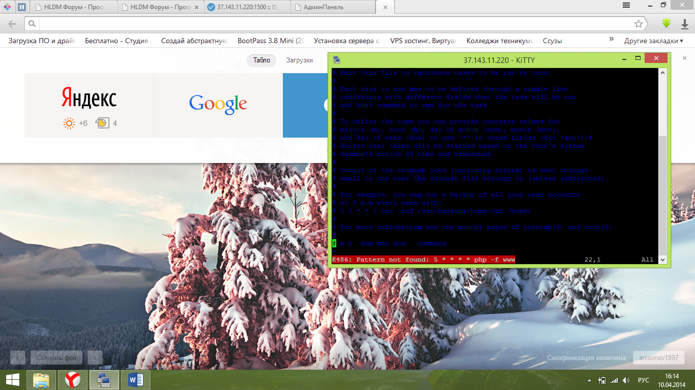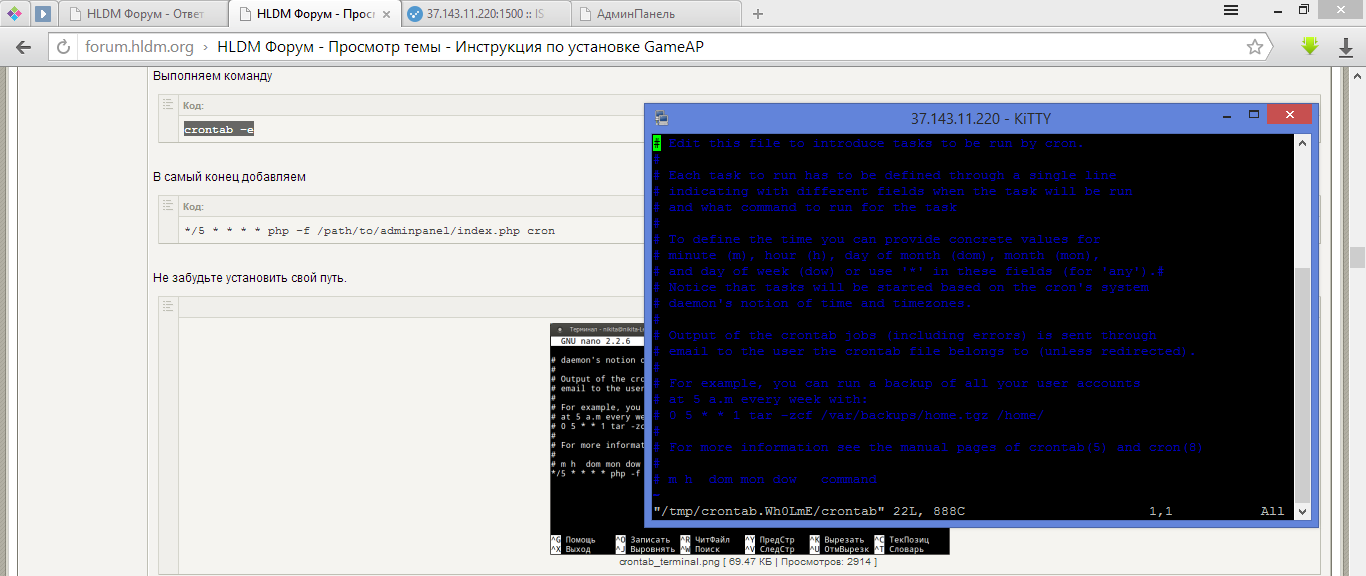 у меня VPS я хочу перенести с обычного хостинга 2 сервера cs (открывать какой либо хостинг не собираемся) у меня OC: Debian 7.0 + панель ISPmanager для начала я создал аккаунт пользователя в IPS и поставил на него GameAP. Вот ссылка http://www.pws-cs.tk/но вот дальше у меня проблема с cron так как не когда не использовал её как я понял там надо войти через ssh в консоль моего профиля на котором стоит панель, и прописать 2 команды == Выполняем команду Код: crontab -e В самый конец добавляем Код: */5 * * * * php -f /path/to/adminpanel/index.php cron но после второй команды выскакивает ошибка