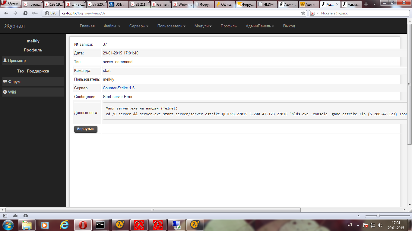 Ошибка базы данных. Error Number: 2006 MySQL server has gone away INSERT INTO `gameap_logs` (`type`, `command`, `user_name`, `server_id`, `msg`, `log_data`, `date`, `ip`) VALUES ('server_command', 'start', 'melkiy', '4', 'Команда отправлена на сервер', 'Синтаксическая ошибка в имени файла, имени папки или метке тома.\r\n\nWarning: file(res:///PHP/C:\\server\\C:\\server\\pid.txt): failed to open stream: Invalid argument in server.php on line 1\n\nWarning: Invalid argument supplied for foreach() in server.php on line 1\nСинтаксическая ошибка в имени файла, имени папки или метке тома.\r\n\r\nPsExec v2.11 - Execute processes remotely\r\nCopyright (C) 2001-2014 Mark Russinovich\r\nSysinternals - www.sysinternals.com\nCommand:\ncd /D C:\\server && server.exe start C:/server/C:/server server 5.200.47.123 27018 \"hlds.exe -console -game cstrike +ip 5.200.47.123 +port 27018 +maxplayers 32 +map de_dust2 +sys_ticrate 250\" ', 1422794004, '46.146.230.18') Filename: C:\web\OpenServer\domains\cs-top.tk\system\database\DB_driver.php Line Number: 330