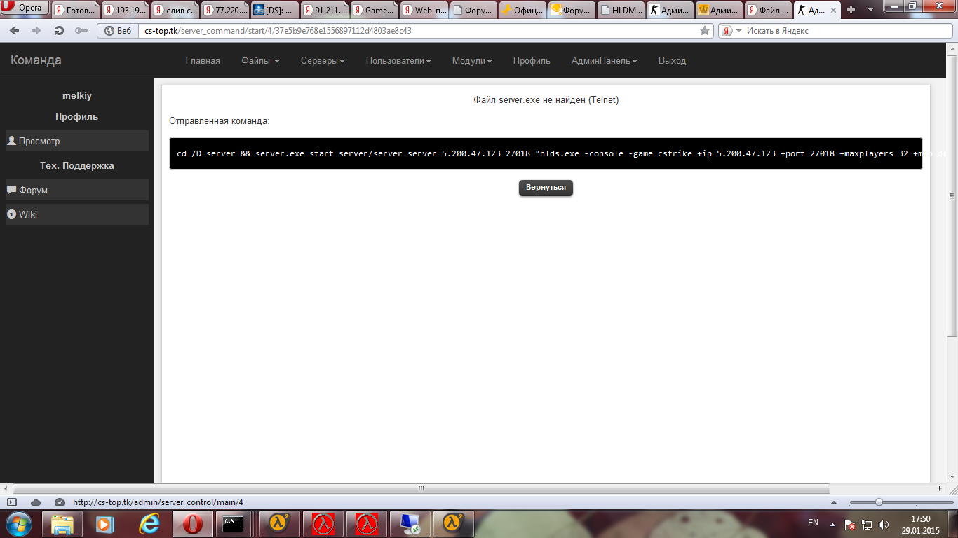 Синтаксическая ошибка в имени файла, имени папки или метке тома. Warning: file(res:///PHP/C:\server\C:\server\pid.txt): failed to open stream: Invalid argument in server.php on line 1 Warning: Invalid argument supplied for foreach() in server.php on line 1 Синтаксическая ошибка в имени файла, имени папки или метке тома. PsExec v2.11 - Execute processes remotely Copyright (C) 2001-2014 Mark Russinovich Sysinternals - www.sysinternals.comCommand: cd /D C:\server && server.exe start C:/server/C:/server server 5.200.47.123 27018 "hlds.exe -console -game cstrike +ip 5.200.47.123 +port 27018 +maxplayers 32 +map de_dust2 +sys_ticrate 250"