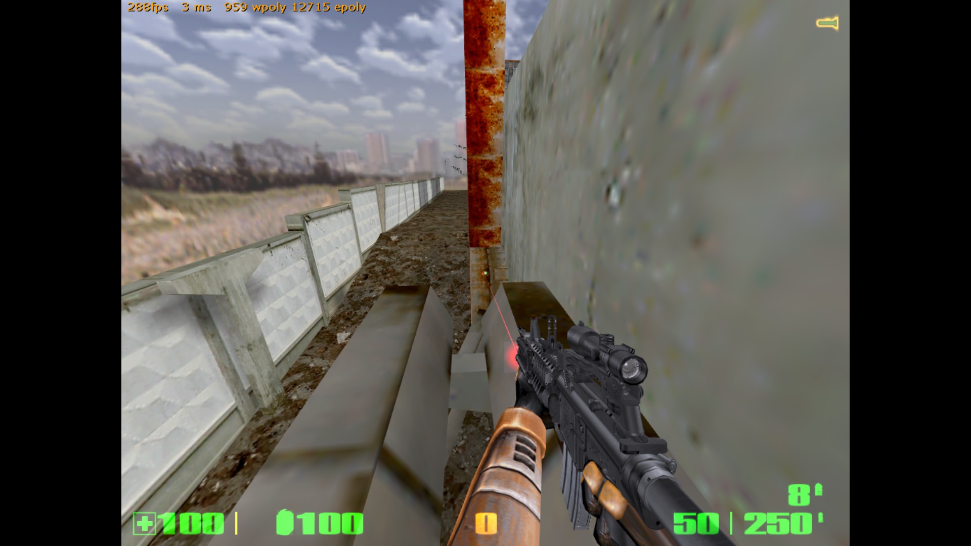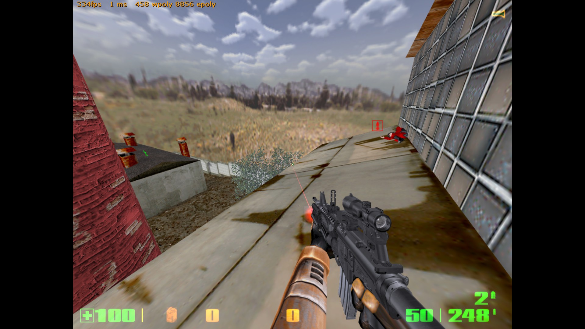 Всем спасибо! Подводим итоги тестирования. Всего тестеров было 10 человек, это из тех, кто отписал своё мнение. Идеи были учтены, обдуманы и обработаны. Отвечу на последние комментарии. 1) Земля сделана умышленно "корявой", объясню почему. Первое, это "разбавить" унылый однообразный вид плоской-преплоской земли на других картах - возьми хотя бы мой stalevar. Как будто катком прошлись. Из-за этого на новой карте почва на половине площади сделана неровной. Второе - чтобы не так просто было попадать из автомата (он наверняка будет здесь самым популярным), потому что при стрейфе игрок будет двигаться по холмам ещё и вверх-вниз. Тем не менее, эта корявая земля выглядит не самым лучшим образом. Вся почва на карте сегодня была удалена, перерисована с нуля, и приведена к более красивому виду. 2) Производительность - это вообще бич этой карты! На ранних версиях там был полный атас. Сейчас удалось немного причесать. И всё равно какого-то фига игра прорисовывает объекты там, где не должна. Пример - как раз скриншот с видимым сквозь стены ангаром. Самая соль в том, что внутренняя обстановка центрального здания прорисовывалась даже в том случае, если находиться сбоку, а особенно - если смотреть с крыши разрушенного здания. Это все можно увидеть, если посмотреть на версию, с которой начиналась эта тема. Я пытался ограничивать видимость и прорисовку всем, чем можно - хинт-брашами, перемещением зданий, перемещением входов. Всё без толку. Отрисовано то,чего не видно. Сейчас стало получше, это как следствие п. 1 - земля была перерисована и вообще удалено всё, что ниже уровня почвы (это к слову про полигоны под картой). Но на большее, похоже, движок не способен. Архитектура карты обязывает. 3) Стены, за которыми ничего нет. Вообще-то, это задумка, обозначающая то, что за забором бывшего завода начинается пустошь, заброшенная местность (ты же читал описание?) К слову, я не единственный, кто балуется такими "обрубленными" картами. Больше всего я их видел у автора DocRock ( https://gamebanana.com/search?query=DocRock ). Вспомни хотя бы небезызвестный cliffside. Карта вообще как будто в воздухе висит. Сначала кажется необычно, но потом привыкаешь и не замечаешь этого. 4) Арбалет, лежащий на земле. Он появился там не просто так. Он призван дать адекватный ответ тому, кто засел на крыше около надписи "Слава труду" и простреливает всю площадку около трубы (да и с другой стороны центрального здания тоже). Если лезть на блоки - гарантированно попадёшь под его огонь. В данном же случае можно быстро схватить арбалет и просто снять его с крыши. И да, на самом деле на карте нет принципа "арбалет нужно заслужить". Есть другой принцип, "бери арбалет и иди на крышу". Потому что здесь на земле с арбалетом делать нечего. Вспомни deadlab, где оружие надо было ещё донести до места его оптимального применения. Вот с арбалетами тут то же самое. 5) Аптечки на крыше позволят стоять там и отжираться, а ещё это будет дополнительной плюшкой для тех, кто занимается исключительно полётами на гауссе. Как правильно сказал Nitro "кто владеет здесь гауссом - владеет всем". Чтобы ослабить эту власть, аптечки расположены исключительно на земле. По той же причине патроны к гауссу разложены по разным местам и в ограниченных количествах. 6) Арбалетные патроны на крыше гаража. Начнём с того, что туда не обязательно летать гауссом - достаточно лонгджампнуть с соседн