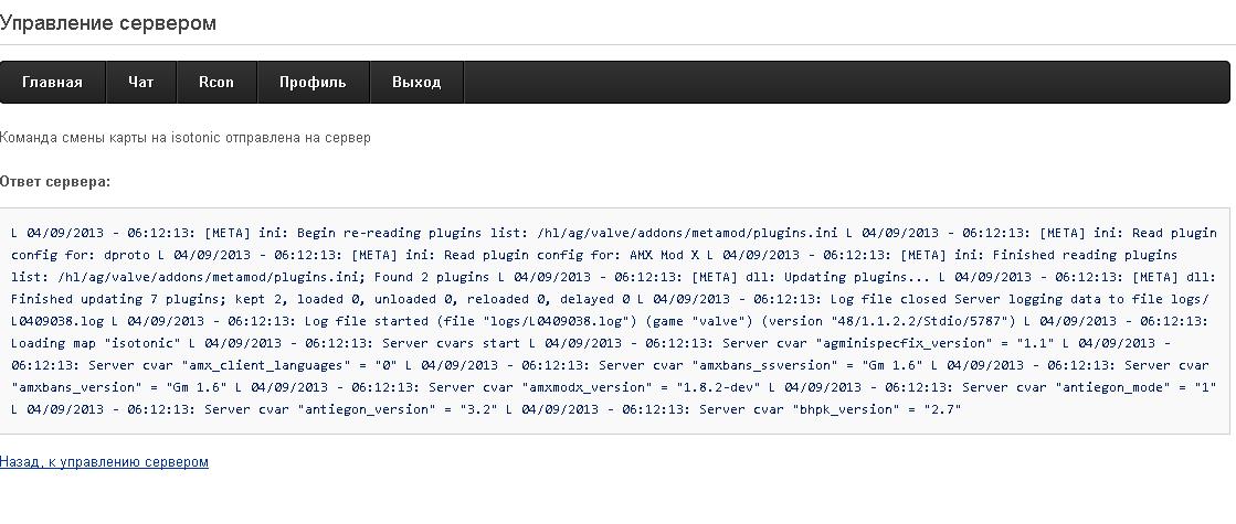 Изменения: [+] Подтверждение запуска/перезапуска/остановки сервера; [+] Вывод названия сервера в заголовке; [+] Статус сервера (онлайн/оффлайн); [+] Смена карт; [+] Мягкий рестарт (перезагрузка карты), при обычном рестарте сервер выключается и включается, при софт рестарте этого не происходит; [fix] Отображение кнопок в соответствие со статусом сервера; [fix] Символ "l" в ответе сервера не появляется;
