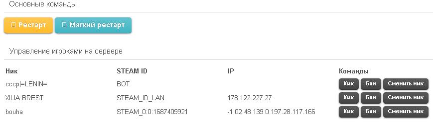 Значение status: Код: hostname: UMI7EPATOP CEPBEP - HLDM.ORG version : 48/1.1.2.2/Stdio 5787 secure (70) tcp/ip : 31.31.202.96:27015 map : crossfire_emperors at: 0 x, 0 y, 0 z players : 3 active (32 max) # name userid uniqueid frag time ping loss adr # 1 "cccp|=LENIN=" 354 BOT 1 11:54:58 0 0 # 3 "XILIA BREST" 343 STEAM_ID_LAN 62 27:38 110 0 178.122.227.27:12221 # 4 "bouha" 353 STEAM_0:0:1687409921 -1 02:40 156 0 197.28.117.166:27005 3 users Появляется всегда, когда у игрока отрицательное количество фрагов. Цитата: Я так понял, в чате игры появляется ник админа, который банит, кикает и т.д. Можно ли сделать возможность выполнять все доступные действия анонимно? Заранее спасибо Они и так анонимны. Будет написано, что игрока забанил сервер. А если ты про чат, то наверное Никита специально добавил вывод имени админа в общий чат.