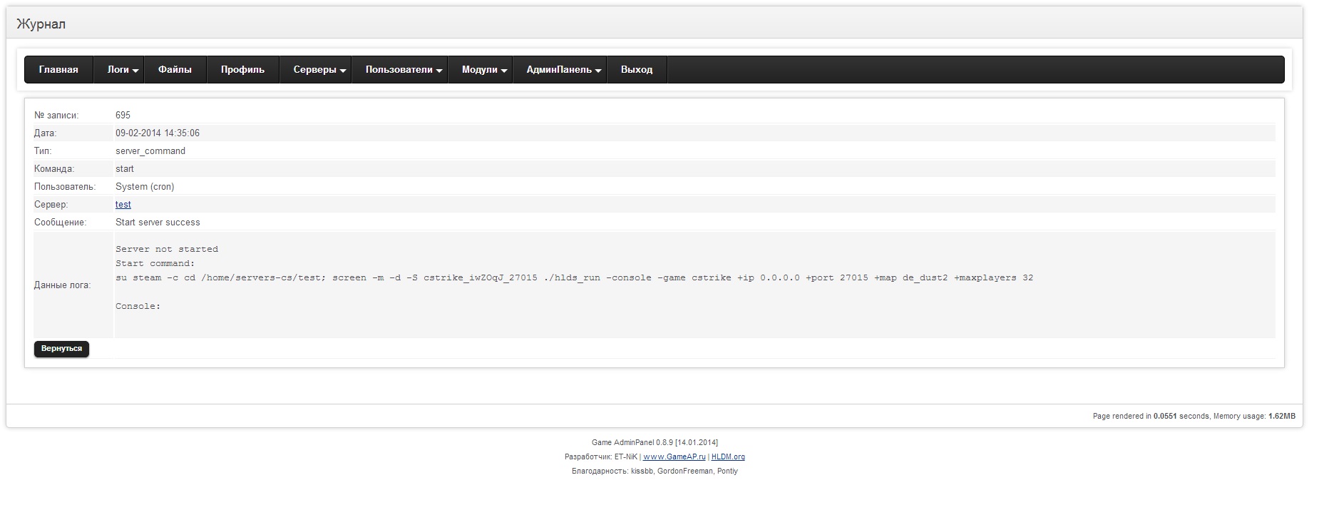Исправил всё равно не стартует... ( где можно посмотреть логи попытки запуска ??? В вебе пишет сладующе Код: erver not started Start command: cd /home/servers-cs/test; screen -m -d -S cstrike_iwZOqJ_27015 ./hlds_run -console -game cstrike -heapsize 1024000 +master -insecure -sys_ticrate 1200 -pingboost 1 +sv_lan 1 +ip 0.0.0.0 +port 27015 +map de_dust2 +maxplayers 21