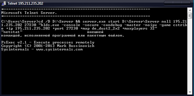 подключился на комп с телнета где стоит сервер все нормально, дальше ввожу команду cd /D D:\Server && server.exe start D:\Server\Server null 195.211.235.202 27230 "hlds.exe -console -secure -condebug -master -noipx -game cstrike +ip 195.211.235.202 +port 2720 +map de_dust2_2x2 +maxplayers 32", выдает ошибку