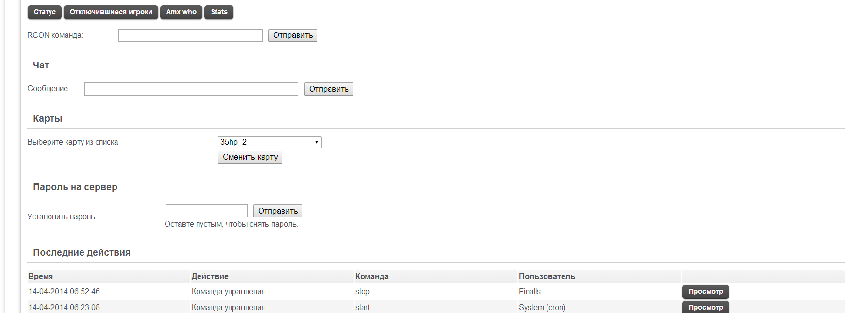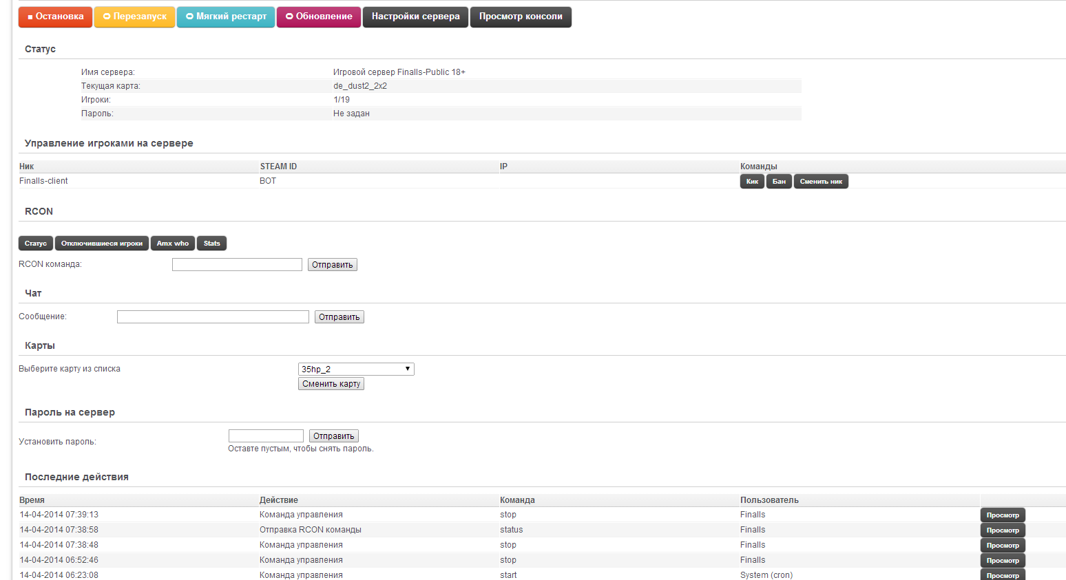 Доброго времени суток. Вообщем такая проблема стоит Game AP 0.9 на локальном сервере. На нём установлен 1 игровой сервер (CS 1.6)... после установки его запускаться он не хотел. Не долгая думая решил потыкать по кнопочкам. И о чудо... Если в настройка сервера ставлю автоматический подъем через cron то сервер запускается. (Убираю галочку сервер не запускается.) Ну ладно как бы то что стартует только с автоподъемом это ничего страшного. Но почему то не работают кнопки перезапуск и остановить сервер. При нажатии их в лог идёт информация о том команда послана на сервер. Скрипт крона отрабатывает но сервер не останавливается и не перезапускается. Все действия выполняются локально. Возник такой вопрос скрипт Server.sh можно ка кто ручками запустить чтобы посмотреть что ему не нравится ?... Т.к. в логах панели всё хорошо и замечательно