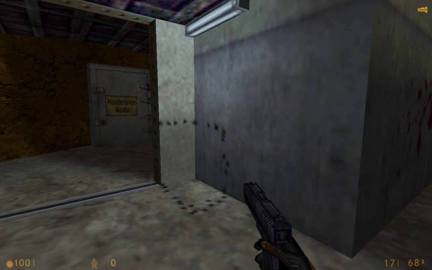 Дверь в комнате охраны. Она сдвигается в сторону, но на ней нарисованы петли! Решение: растяни текстуру, чтобы их спрятать.