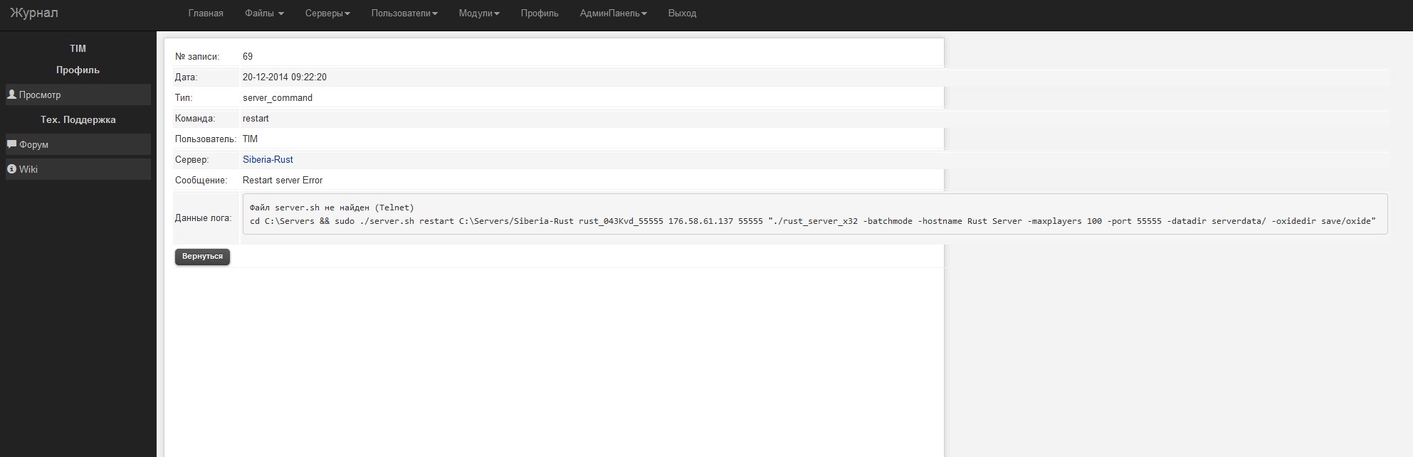 Нет, он не запускается, он не ПЕРЕзапускается, это скрин показывает что на момент нажатия кнопки перезагрузки панель пишет что сервер перезагружен, а сервер стоит на месте