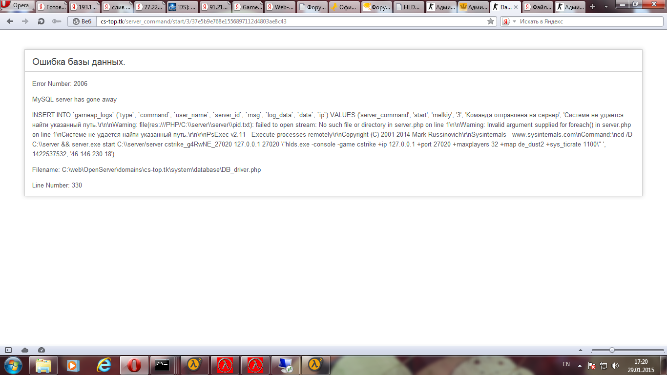 Ошибка базы данных. Error Number: 2006 MySQL server has gone away INSERT INTO `gameap_logs` (`type`, `command`, `user_name`, `server_id`, `msg`, `log_data`, `date`, `ip`) VALUES ('server_command', 'start', 'melkiy', '4', 'Команда отправлена на сервер', 'Синтаксическая ошибка в имени файла, имени папки или метке тома.\r\n\nWarning: file(res:///PHP/C:\\server\\C:\\server\\pid.txt): failed to open stream: Invalid argument in server.php on line 1\n\nWarning: Invalid argument supplied for foreach() in server.php on line 1\nСинтаксическая ошибка в имени файла, имени папки или метке тома.\r\n\r\nPsExec v2.11 - Execute processes remotely\r\nCopyright (C) 2001-2014 Mark Russinovich\r\nSysinternals - www.sysinternals.com\nCommand:\ncd /D C:\\server && server.exe start C:/server/C:/server server 5.200.47.123 27018 \"hlds.exe -console -game cstrike +ip 5.200.47.123 +port 27018 +maxplayers 32 +map de_dust2 +sys_ticrate 250\" ', 1422794004, '46.146.230.18') Filename: C:\web\OpenServer\domains\cs-top.tk\system\database\DB_driver.php Line Number: 330